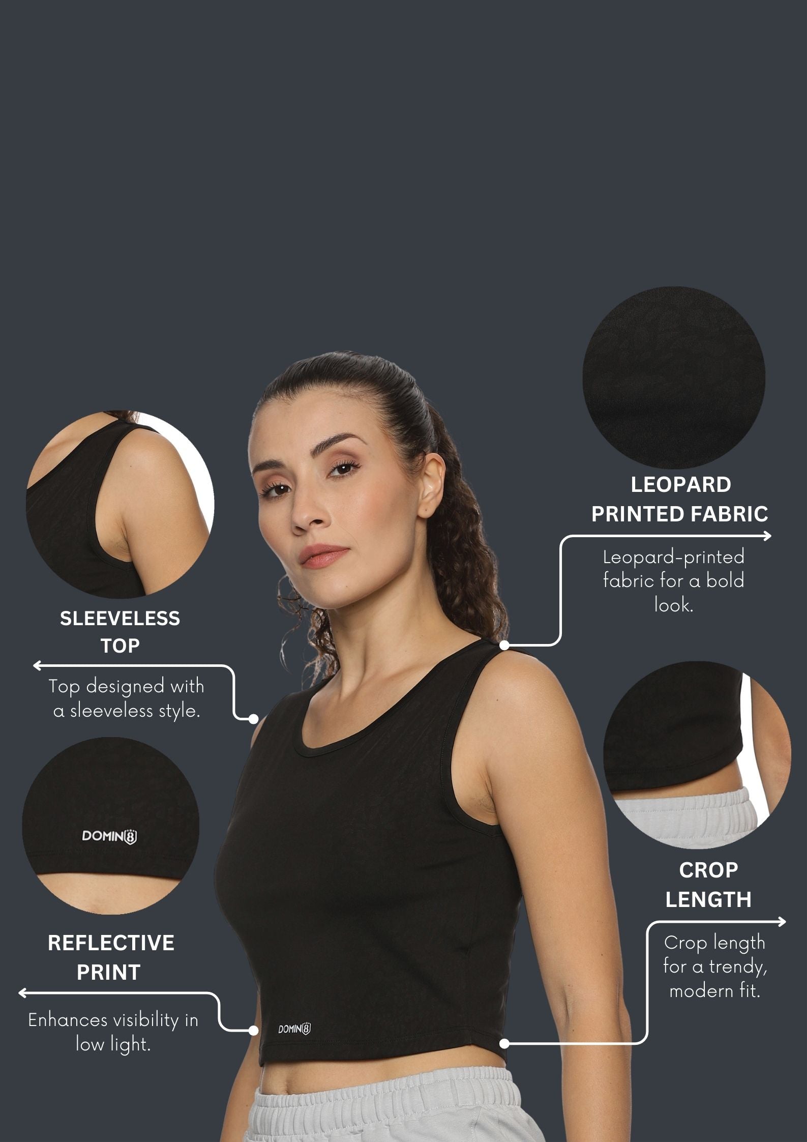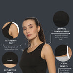 Women's Leopard Printed Black Training Crop Top. It has a Scoop neck , Stretchable Fabric & Reflective logo stickers