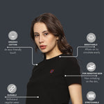 Black short-sleeve spandex crop top for women, designed for gym workouts and everyday wear.