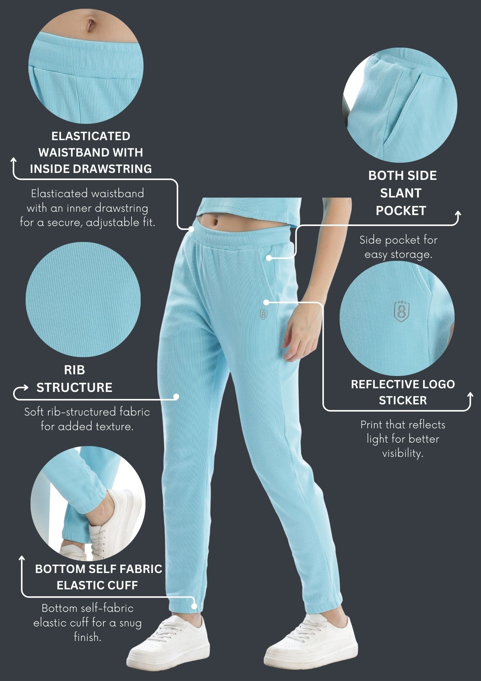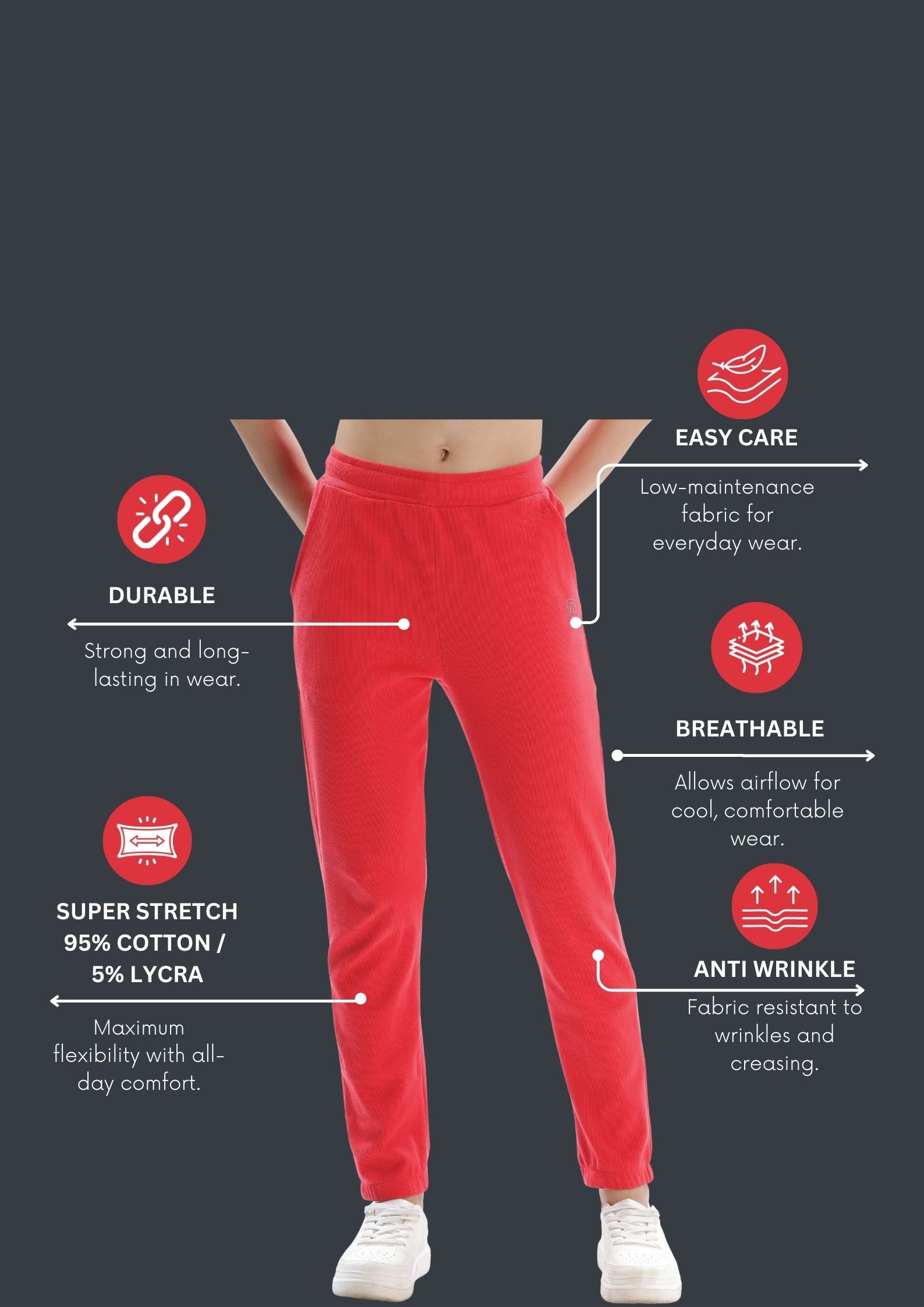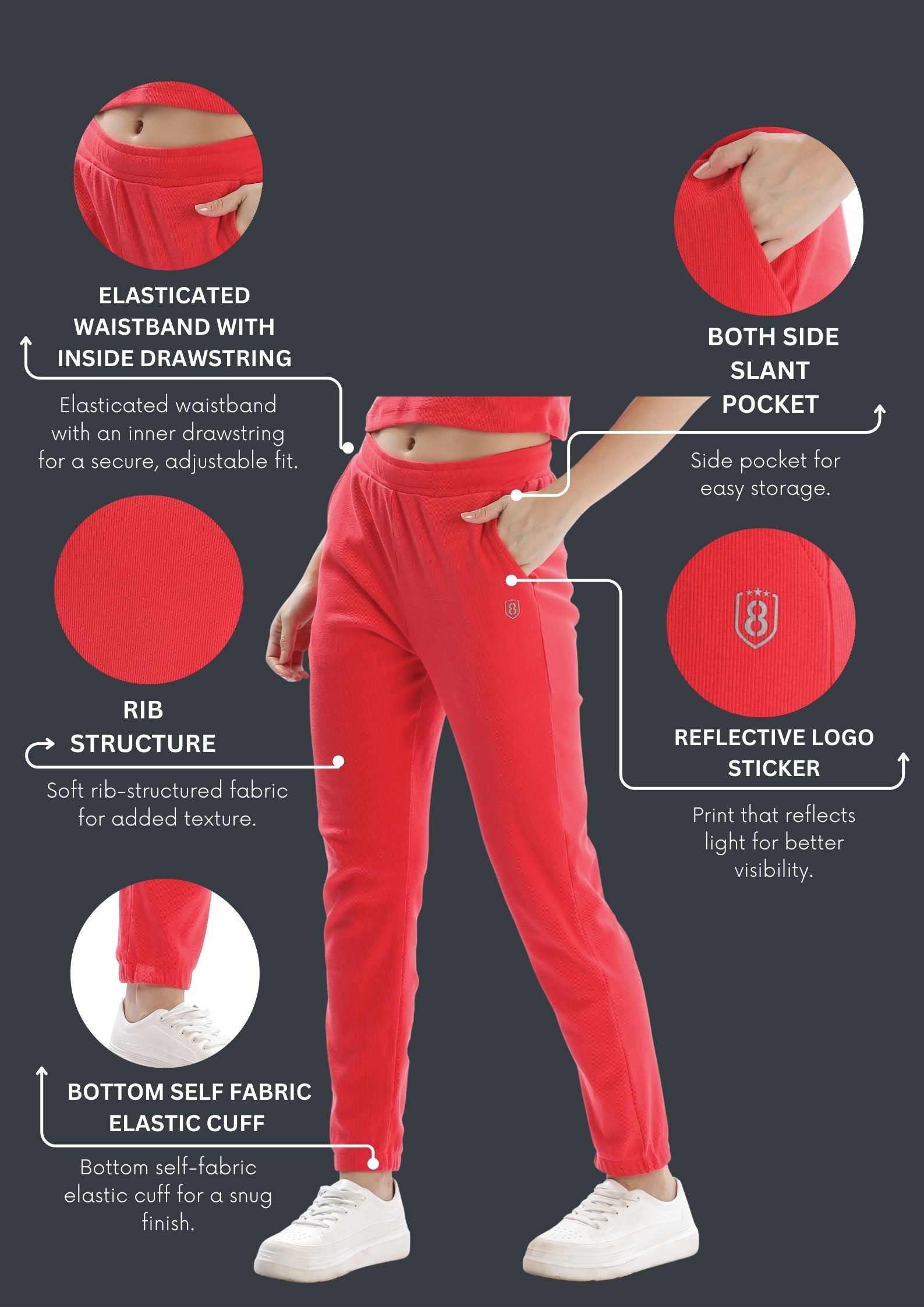 If you value both comfort and style, this jogger and crop top set is a must-have. The red joggers and crop top are designed with thoughtful details like side pockets and a reflective brand logo, making it functional and fashionable.