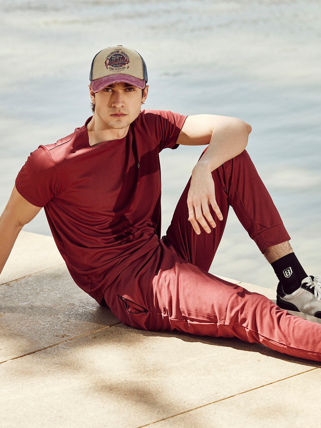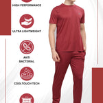 Two-piece men’s red co-ord short set, featuring a lightweight and quick-dry polyester blend.