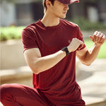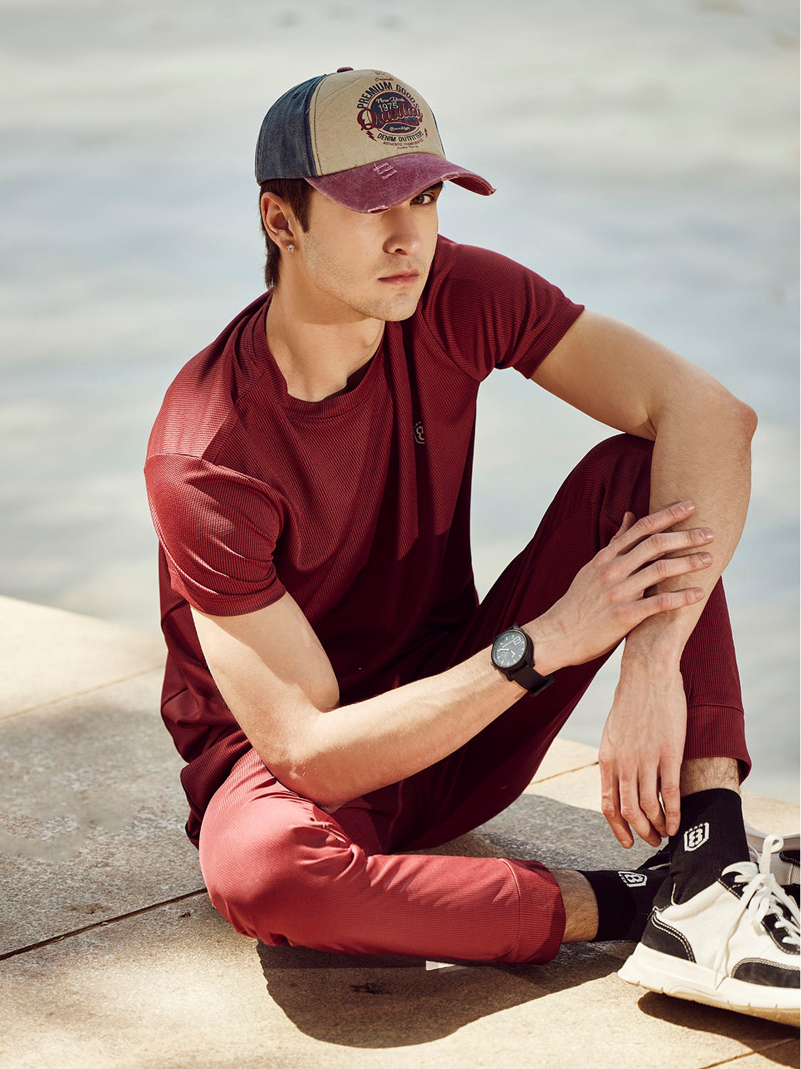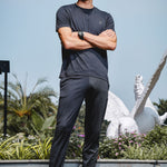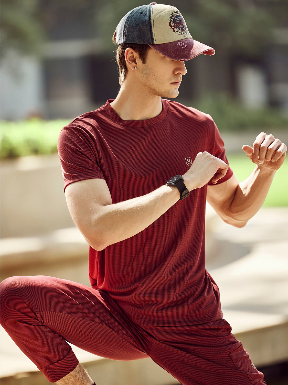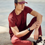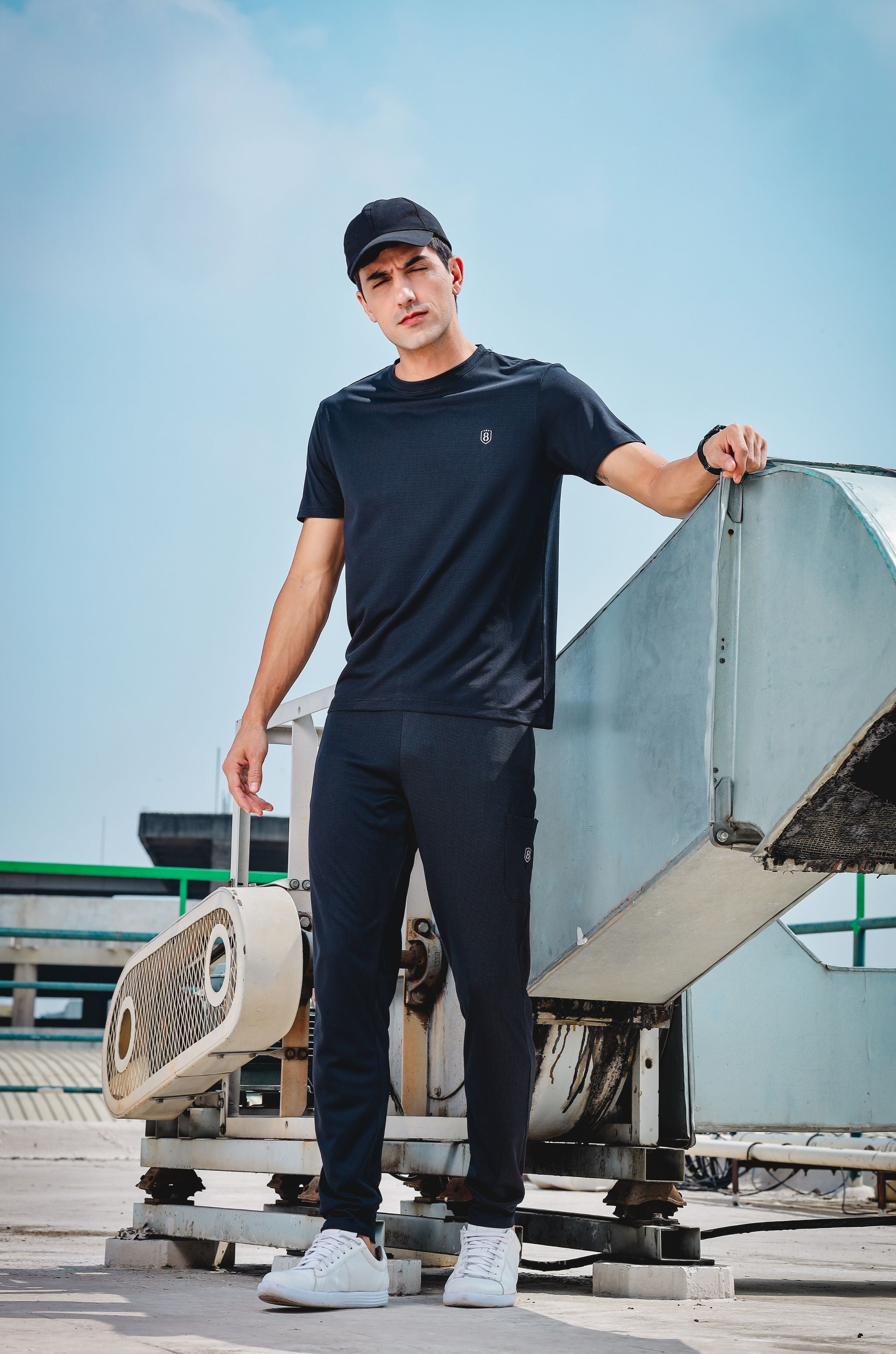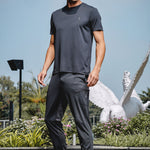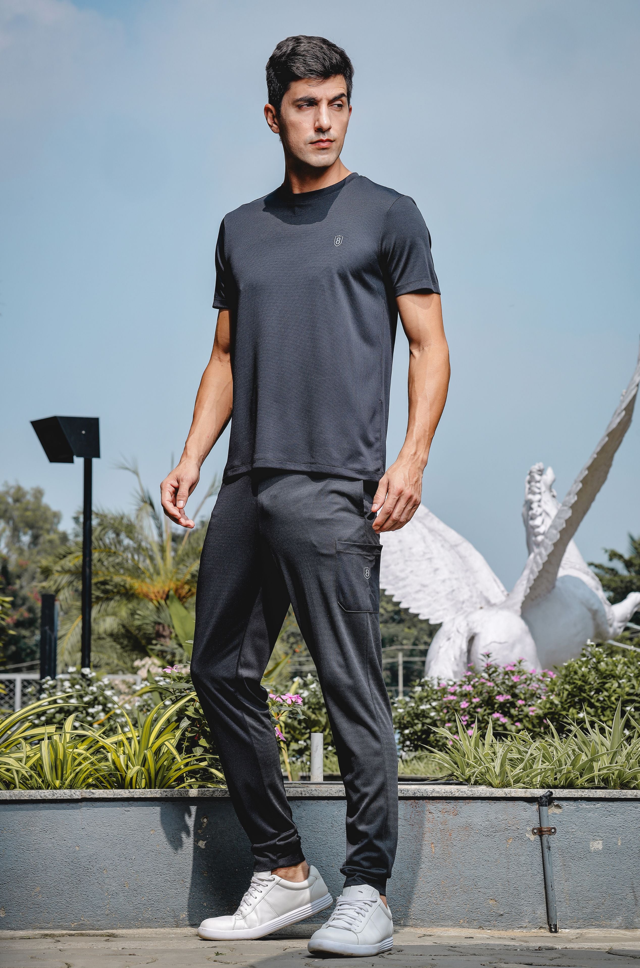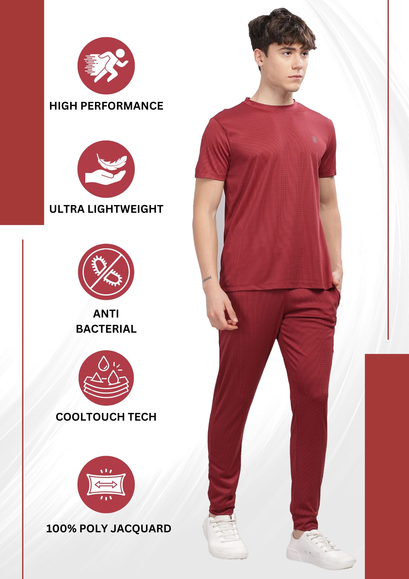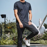 Men's wrinkle-free polyester co-ord set styled for gym or lounge