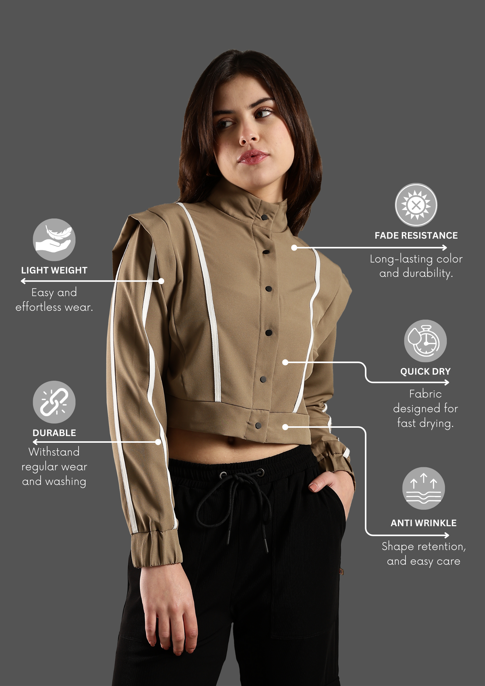 Women's Snap Button Crop Jacket with Elastic Drawstring