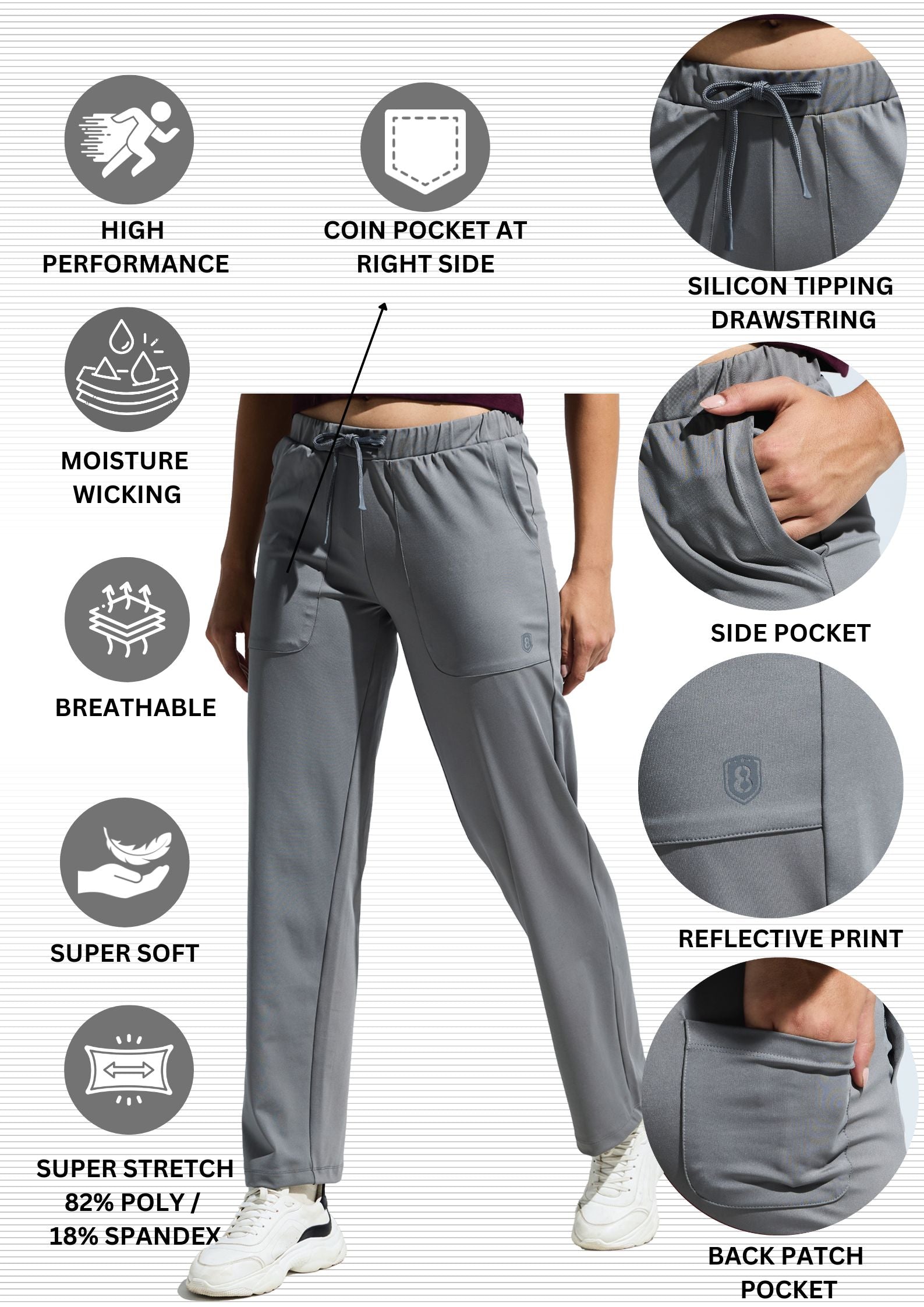 Key Features: Women Straight Pant With Multi Pocket, Elasticated Waistband With Silicon Tipping Drawstring, Back Patch Pocket, Combination Of Comfort, Flexibility, Durability & Stretchability Allows For a Full Range Of Motion.