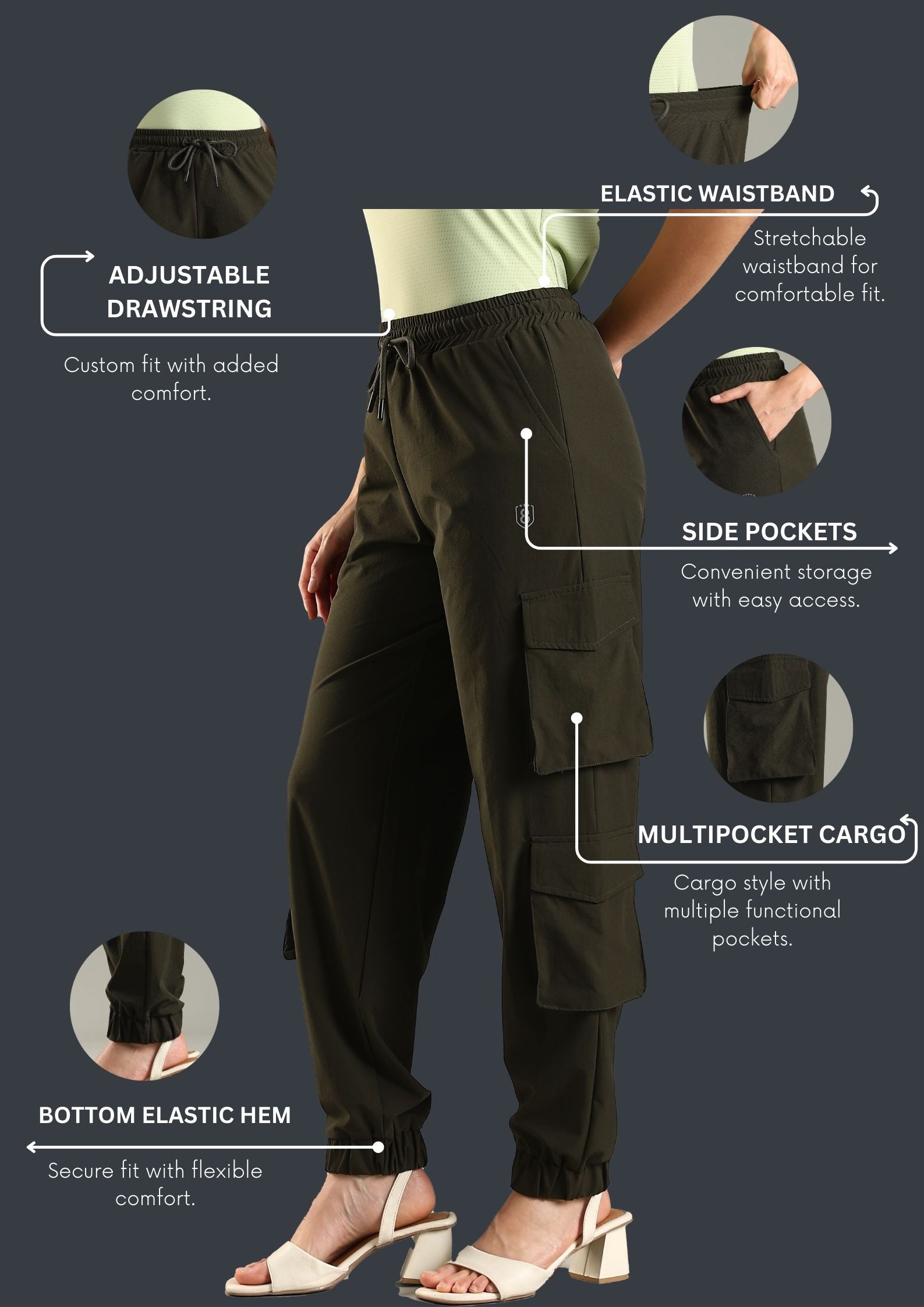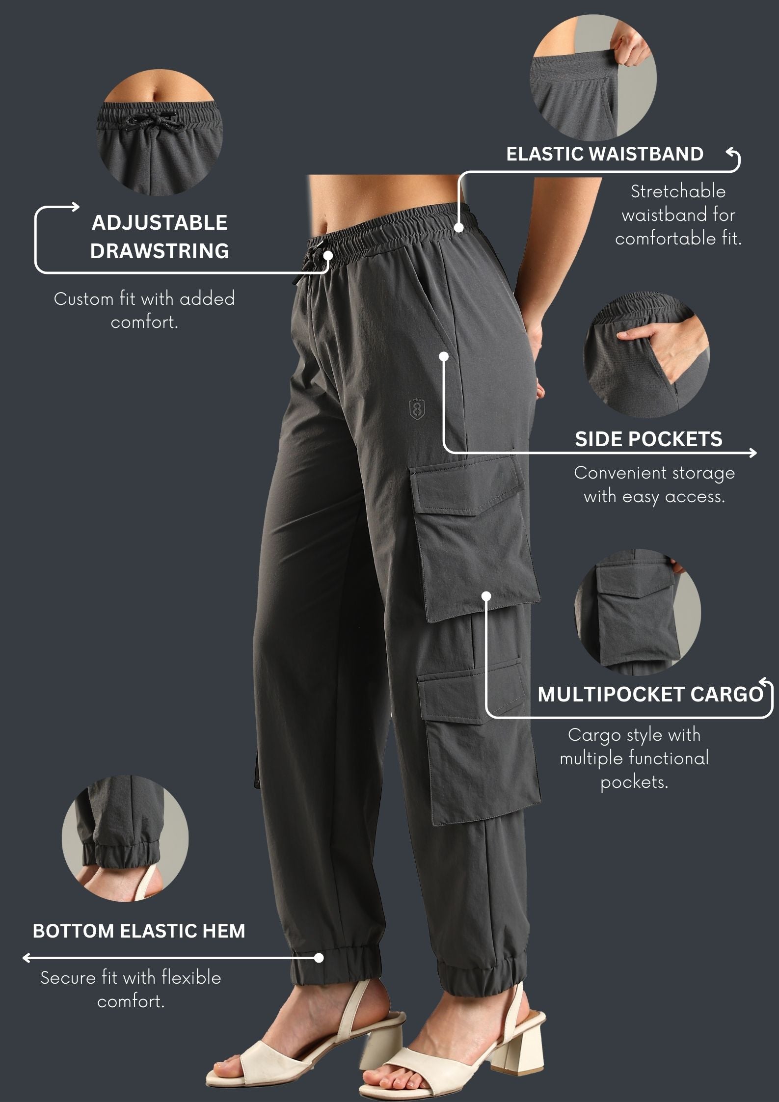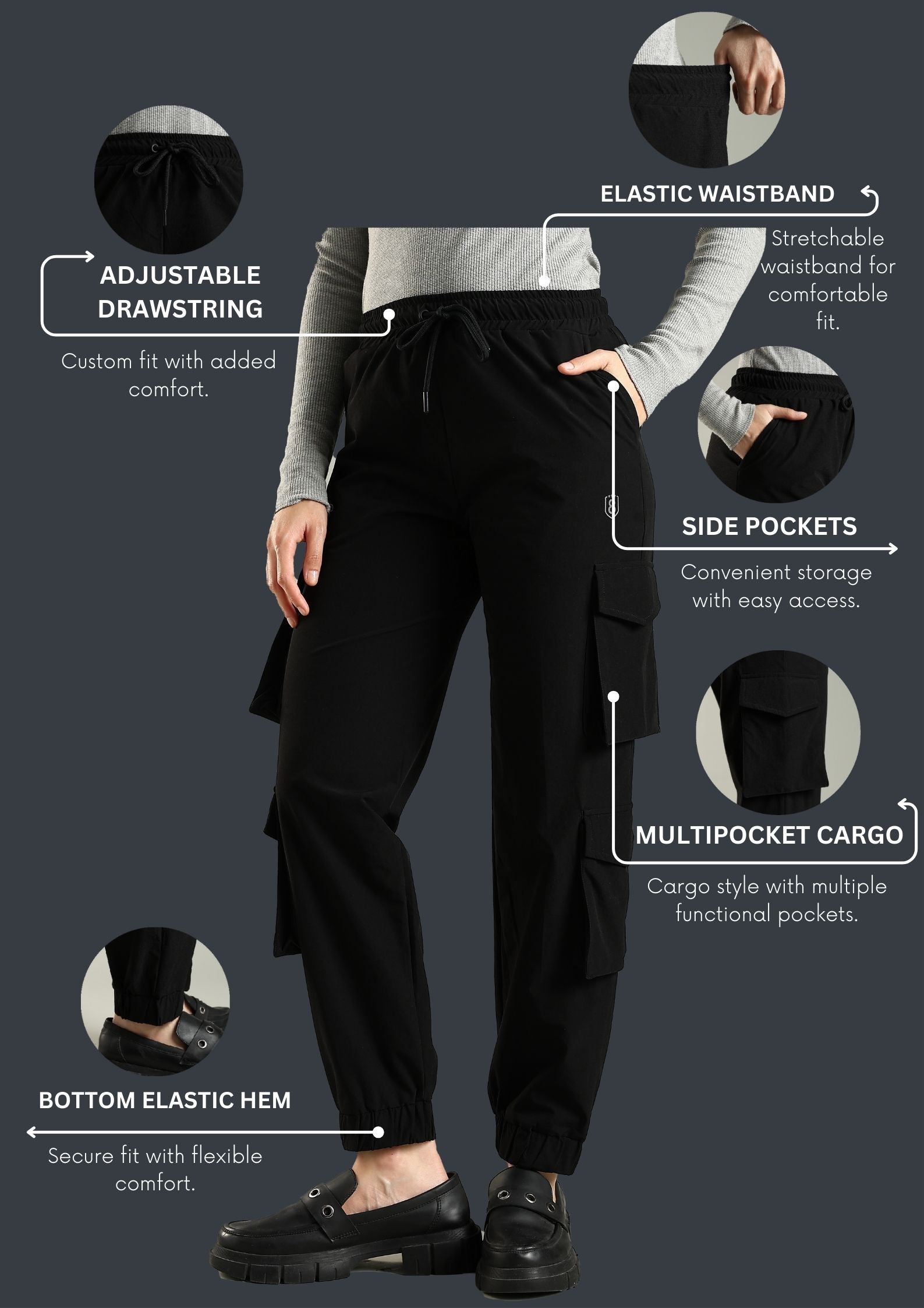 The multiple cargo pockets give you space for all the little things you never know where to keep, and the outside drawstring lets you adjust the fit on the go. The bottom elastic cuff keeps the look neat and modern, whether you’re at your desk or running around getting things done.