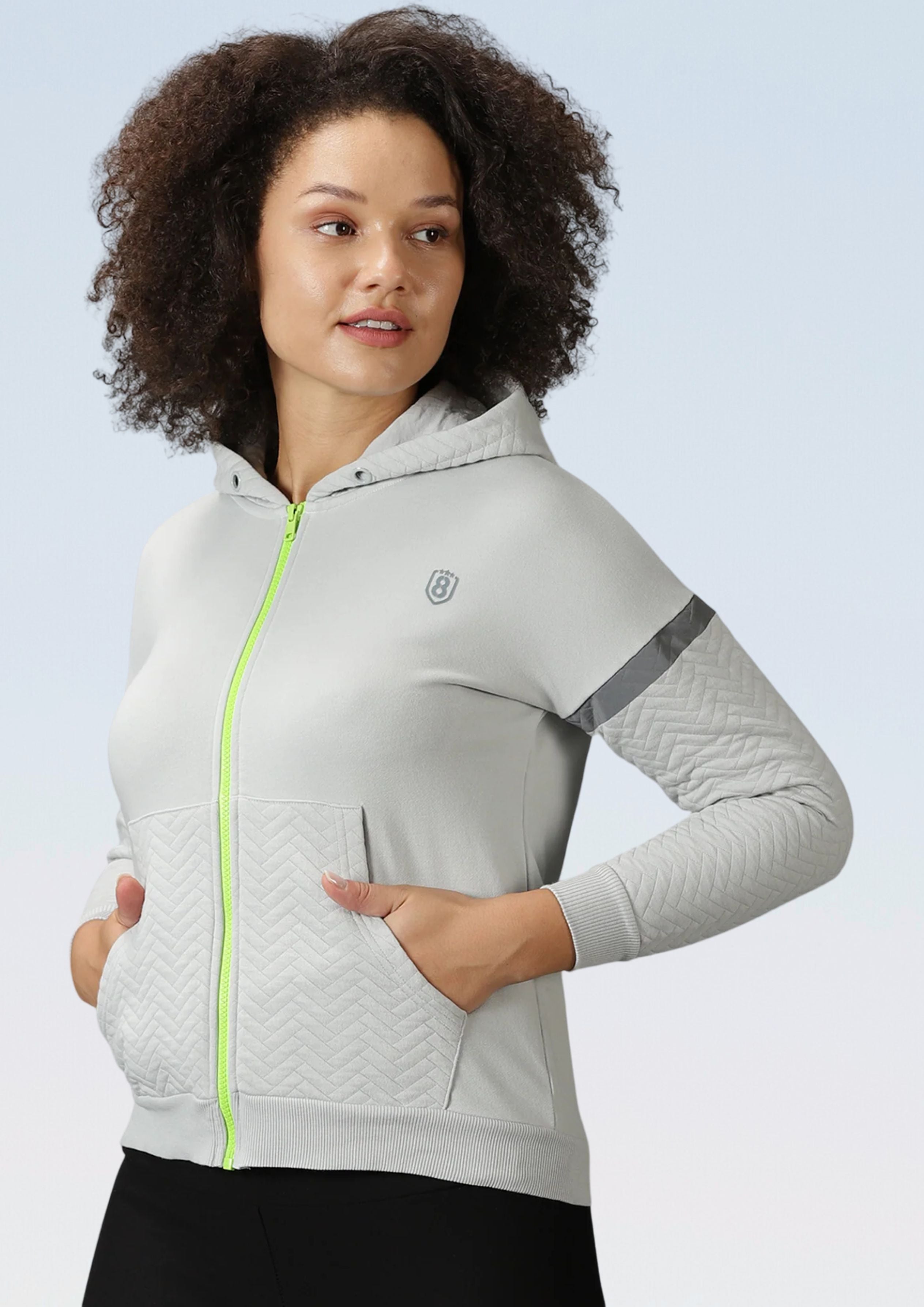 Women's solid quilted drop shoulder hooded Grey sweat shirt with Kangaroo pockets , Zipper closure , long sleeves and straight ribbed hem.