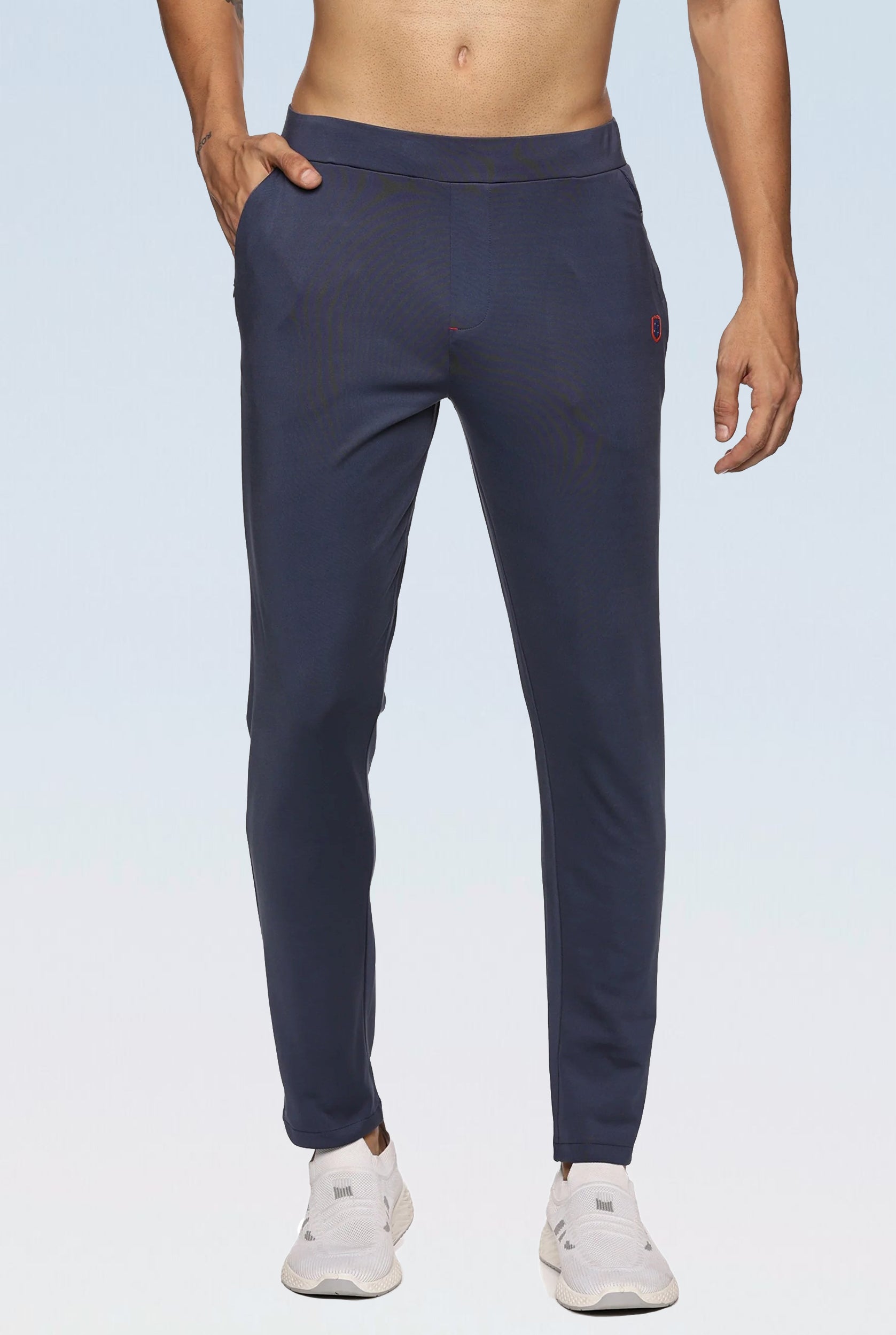 Side view of navy blue slim fit pants for men with secure zipper pockets