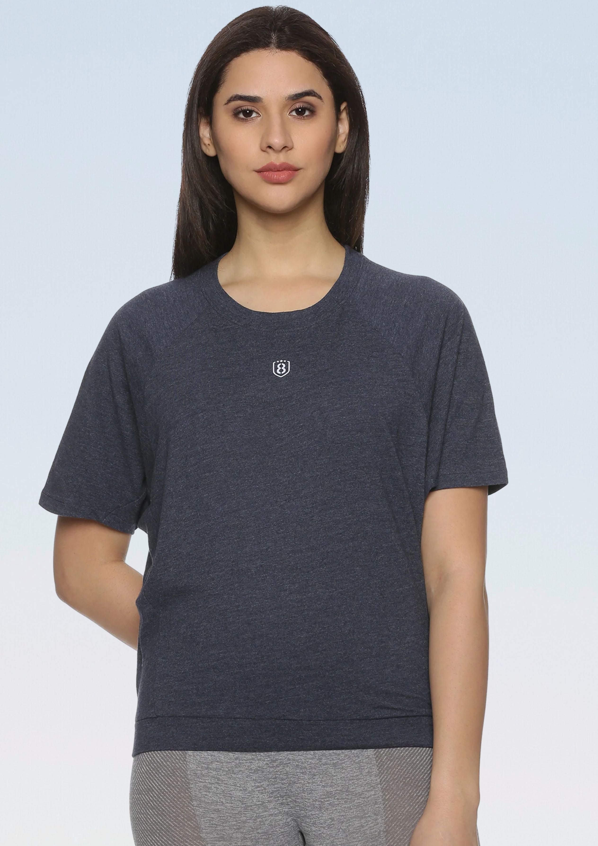 Women's Hexarel Yoga solid top with self-fabric elastic bottom hem. It has a Round neck and Batwing sleeves.